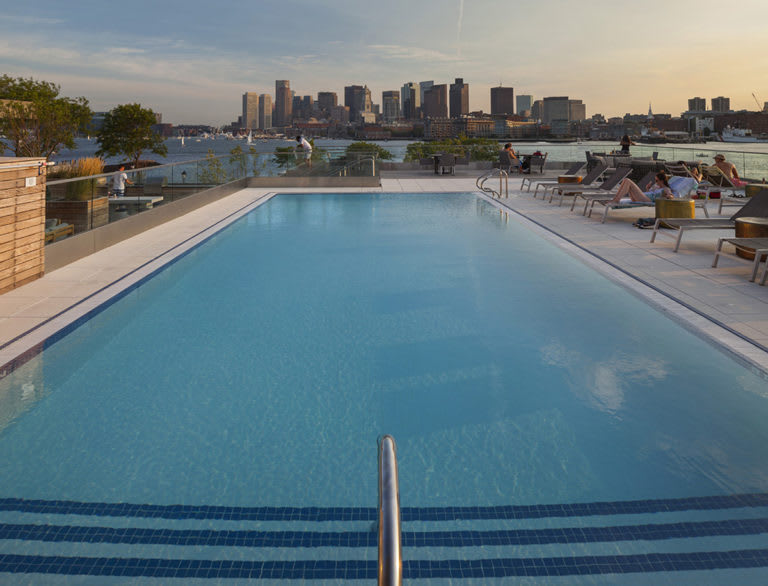 Across the harbor in East Boston lies The Eddy, a luxury apartment building offering unrivaled views and amenities including an outdoor terrace with a pool and sun deck, grilling stations, and a fireplace.