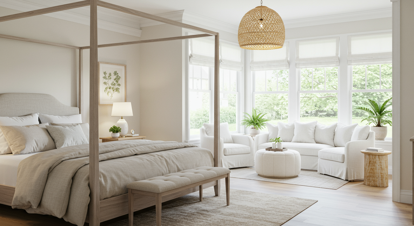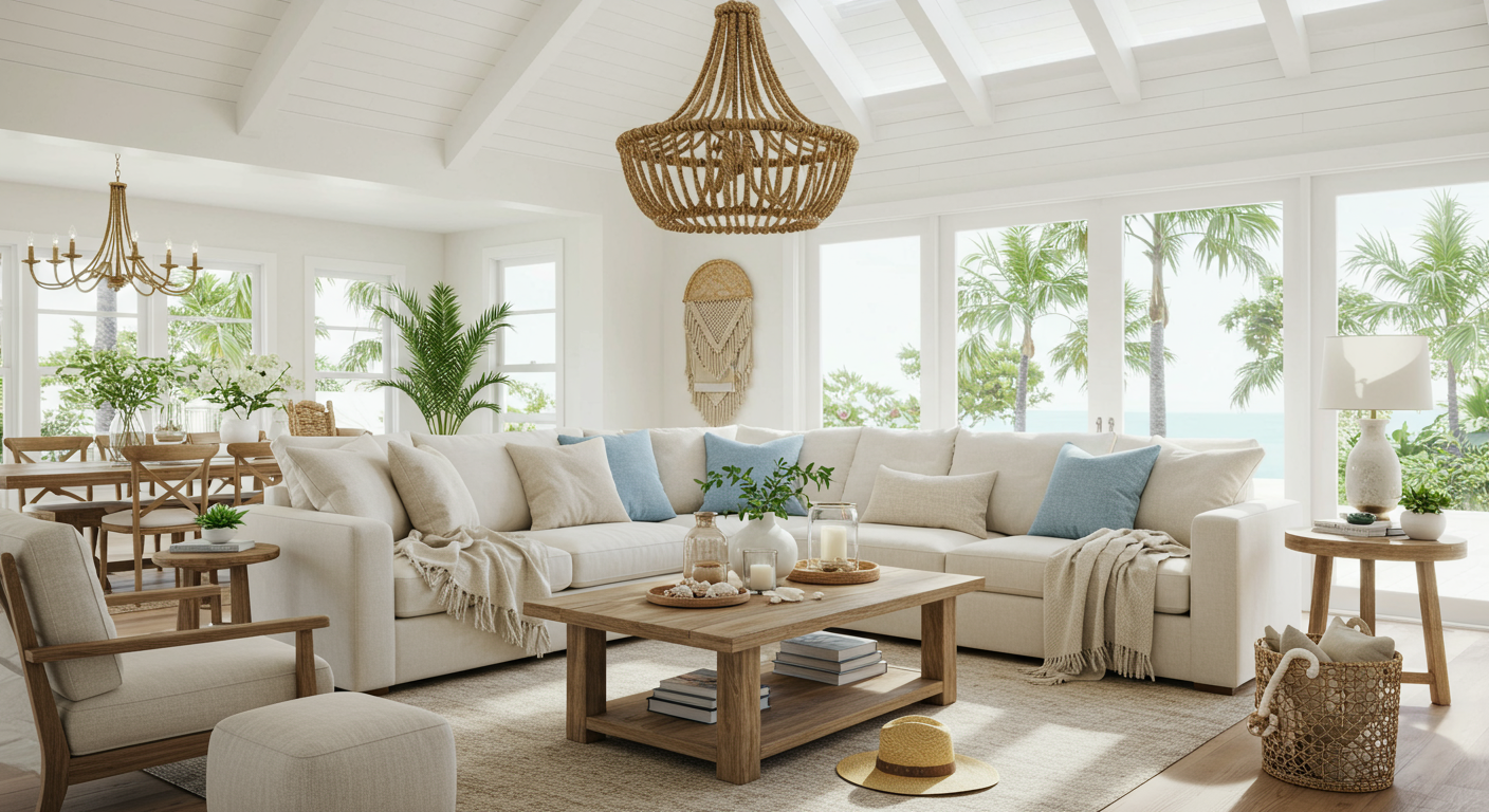 Start with a background of white walls, gentle natural colors of the sand and sky, and crisp, casual materials like cotton and linen. Next, incorporate organic elements like baskets, light driftwood textures, and soft textiles for rugs as well as throw cushions and blankets.