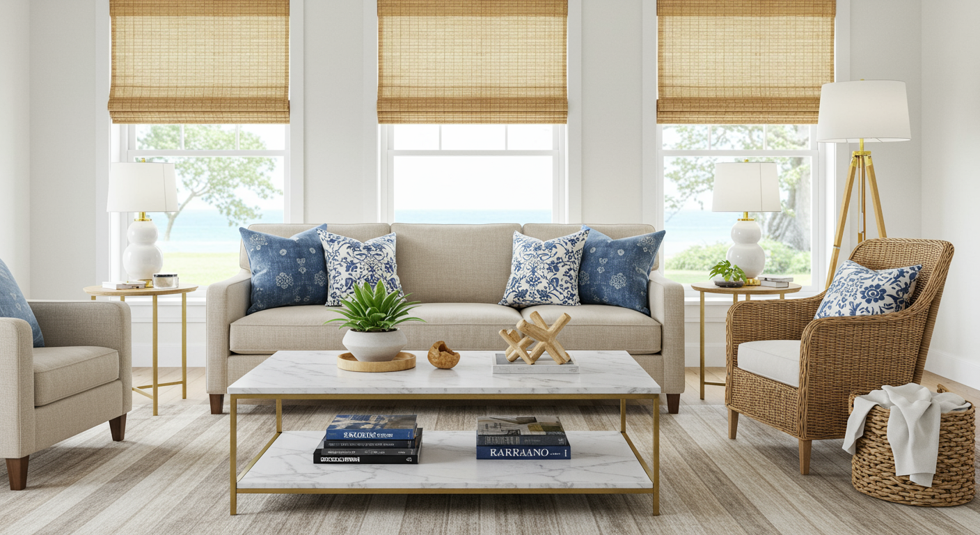 Natural materials such as wood, wicker, and jute are often found in coastal-chic interiors, paired alongside pops of color ranging from fresh blue hues to crisp greens, for added contrast. Variations of coastal design also incorporate woven accents such as baskets, natural fiber rugs, and slipcovers made of materials like linen that add a touch of sophistication.