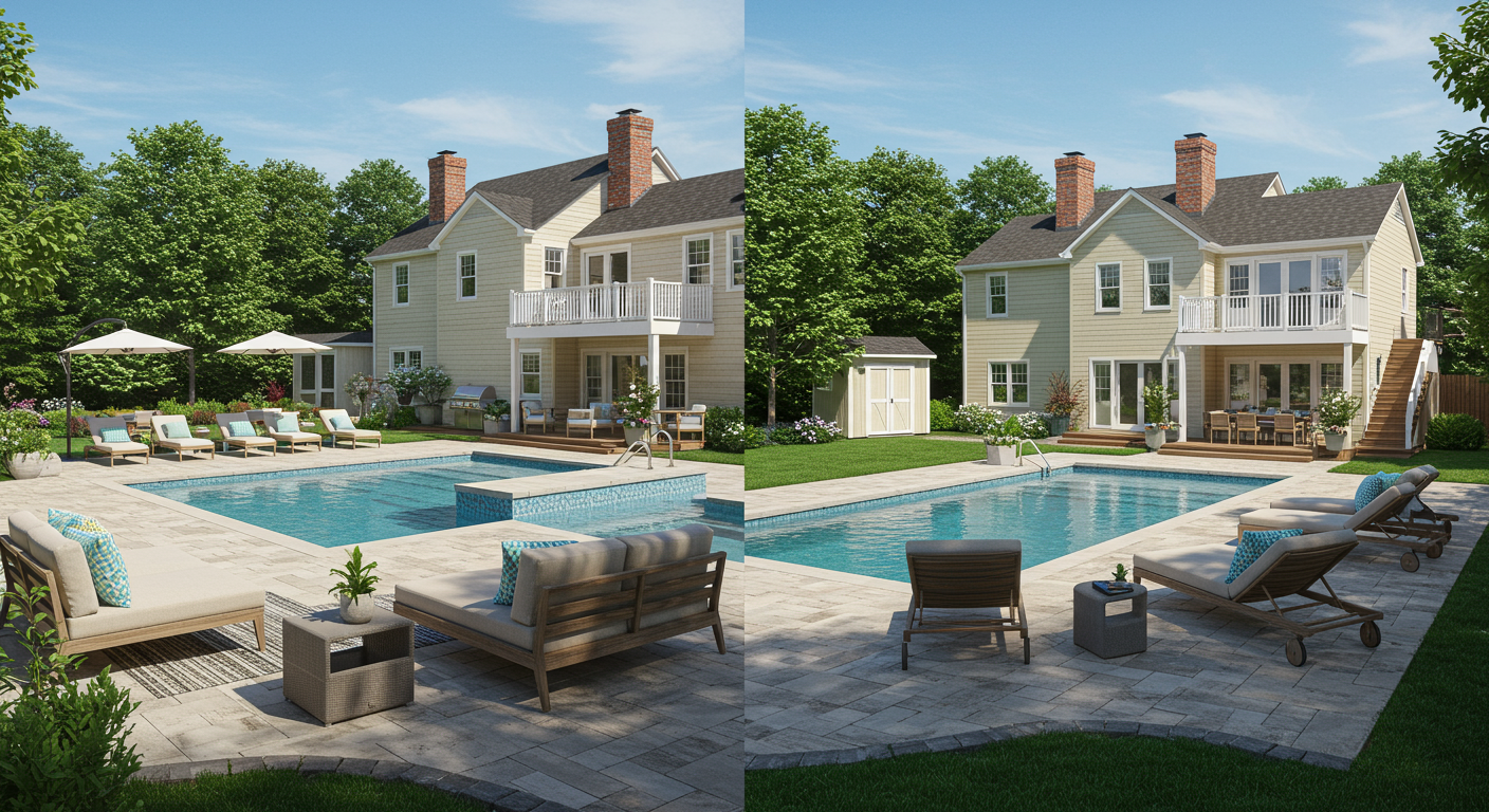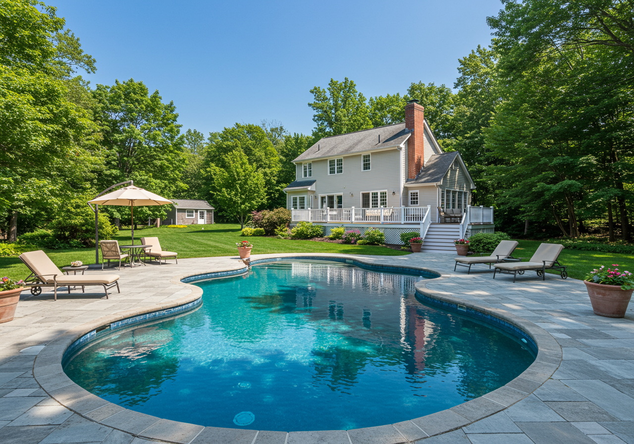 Direct access to your outdoor oasis with an in-ground heated salt-water pool, waterfall spa, pool house and new Triad patio pavers, and professionally landscaped yard overlooking original stone wall and woods.