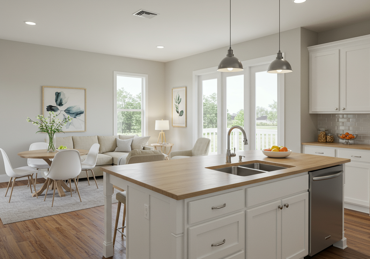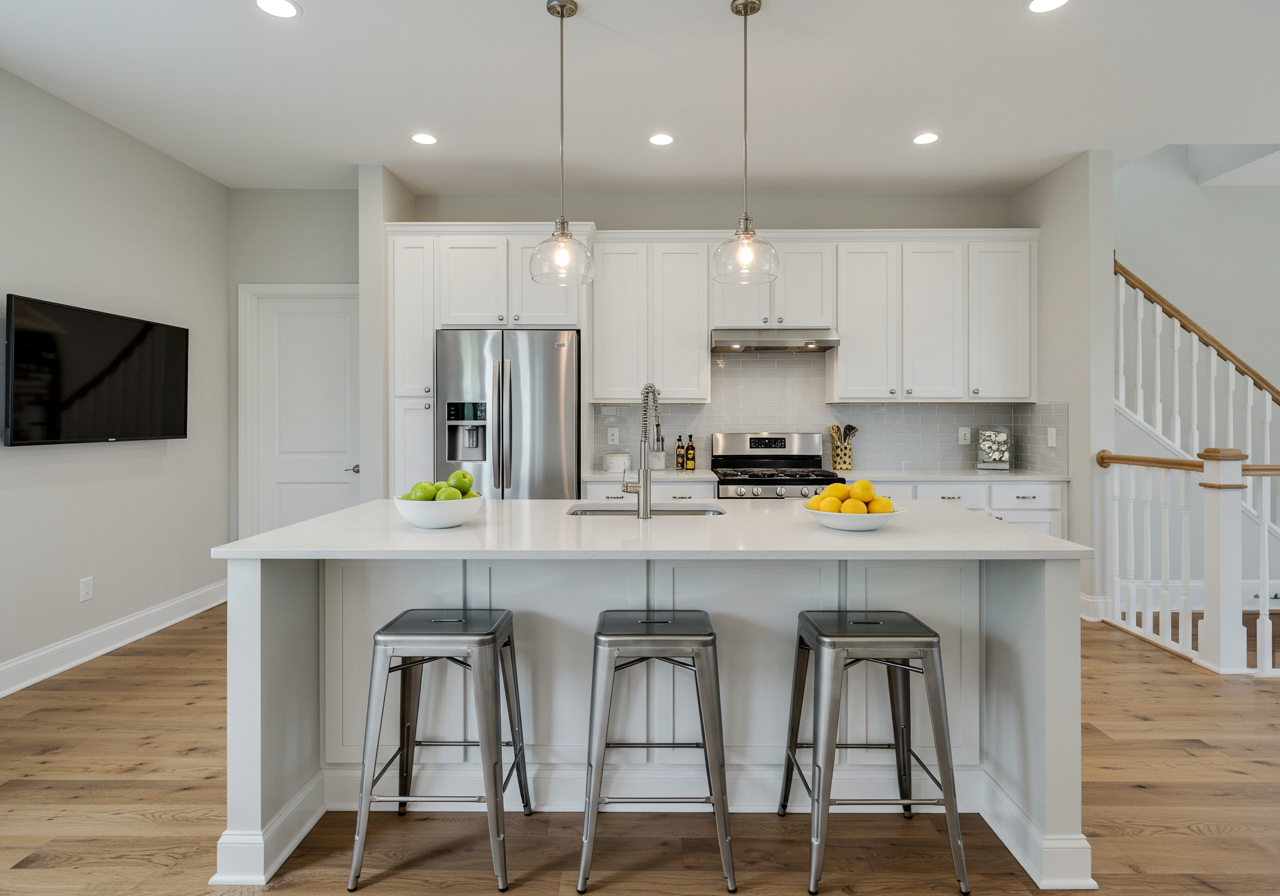 Open living/dining, high-end kitchen, Thermador appliances, gas cooking, Quartz counters with seating room; direct patio access extends living area.