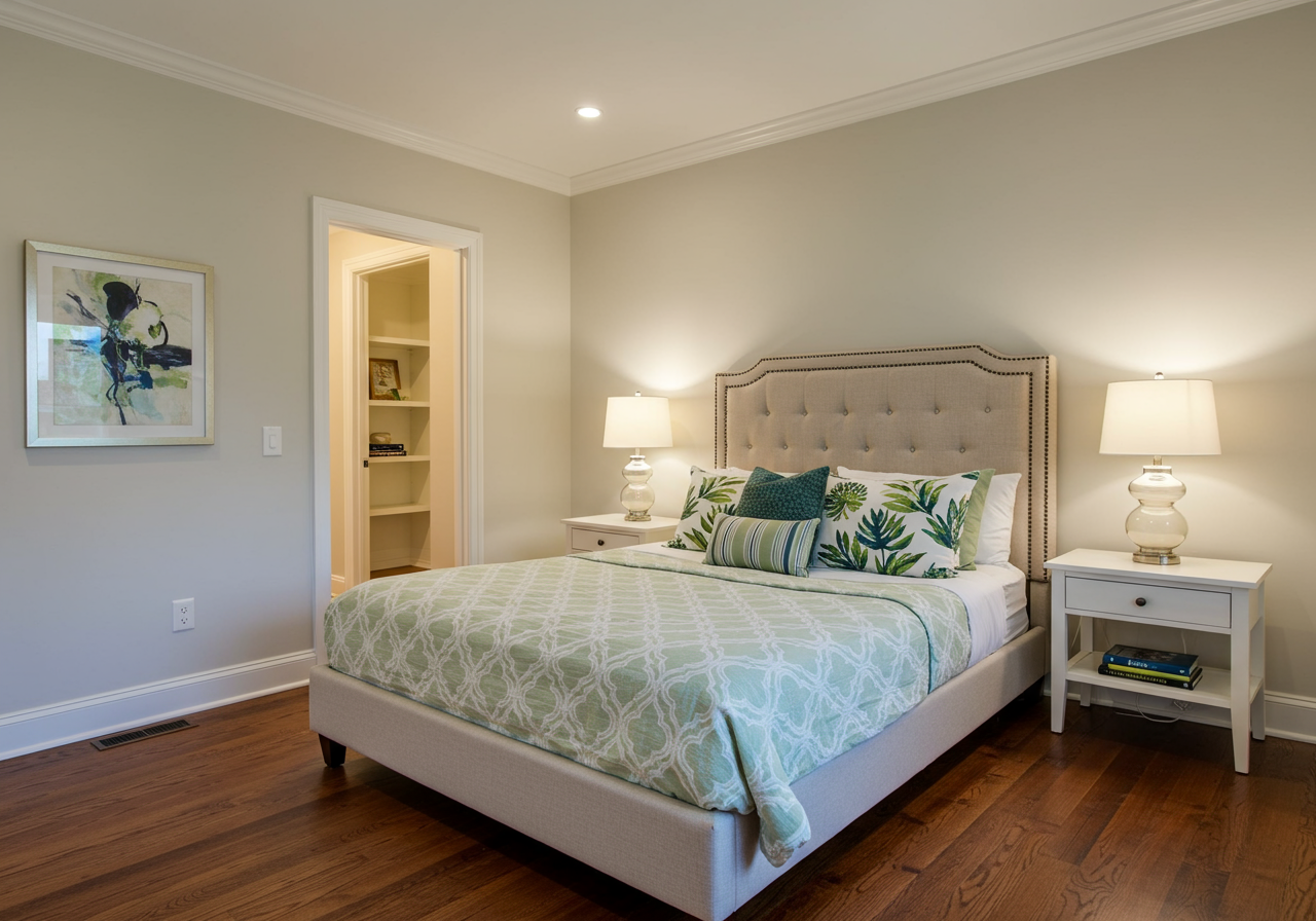 Master Bedroom with walk-in closet, fits King bed; Second bedroom fits Queen bed and is flexible as a guest room or study; Full bath has double vanity and tub/shower.