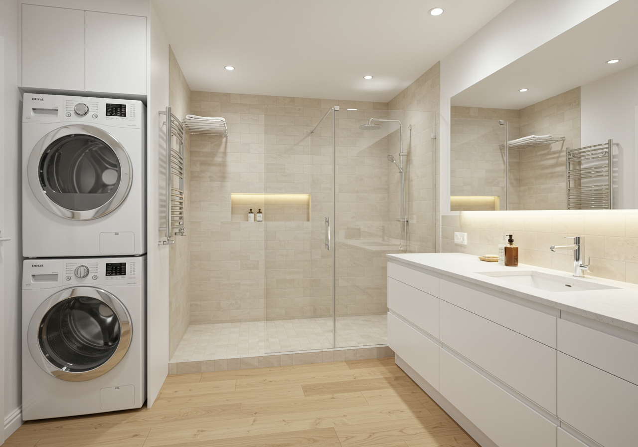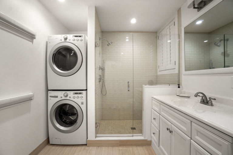 There is a second full bath on this level with single vanity, walk-in shower; the washer/dryer adds convenience.