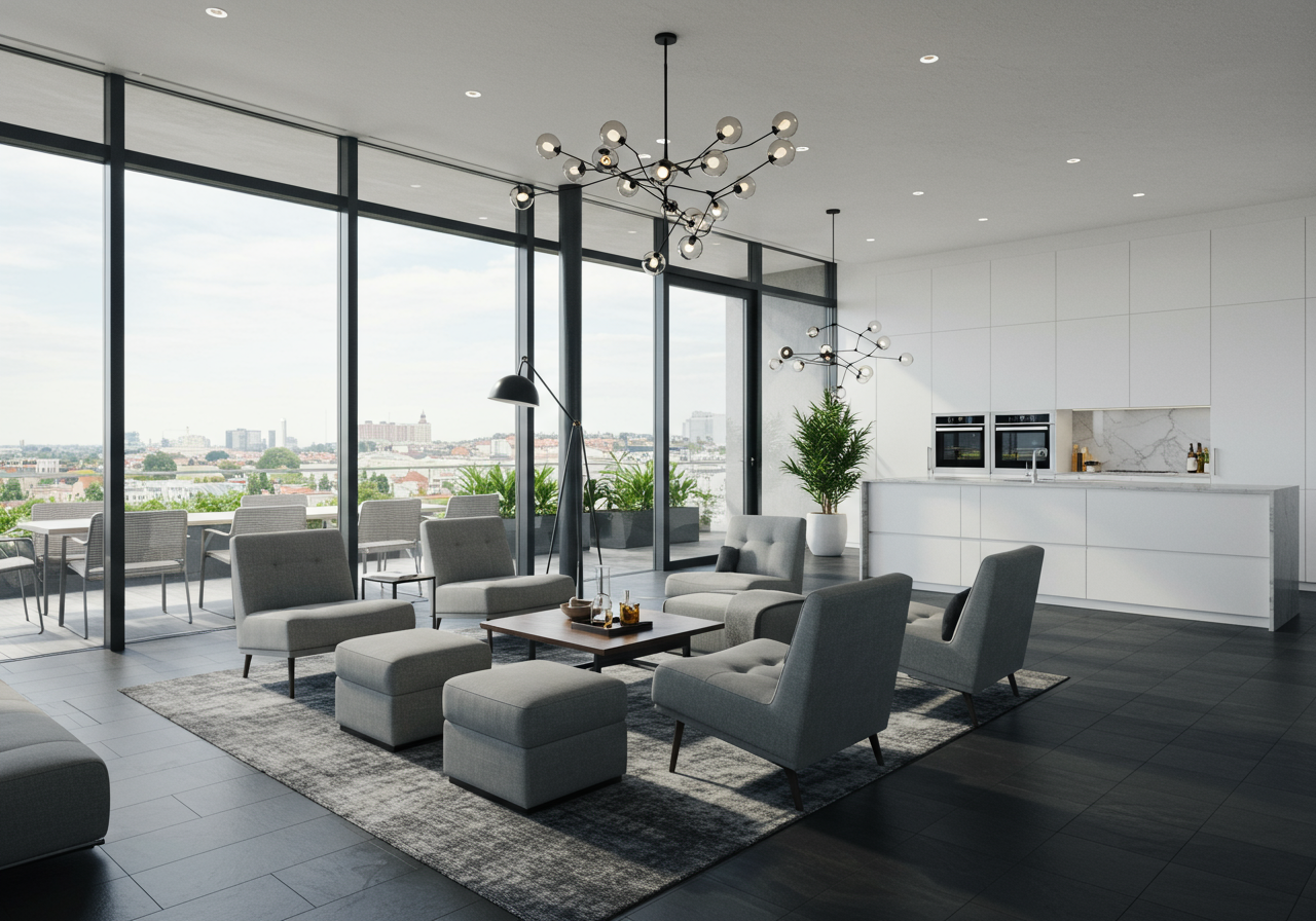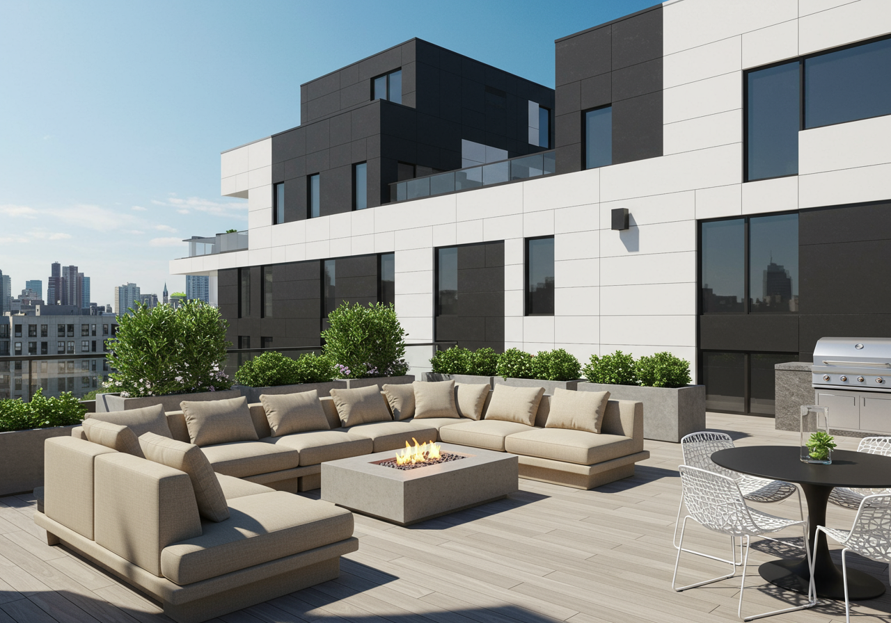 - Rooftop “Sky Lounge” with skyline views and connecting outdoor roof deck