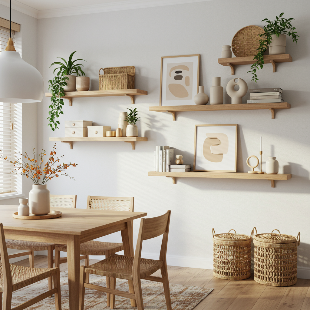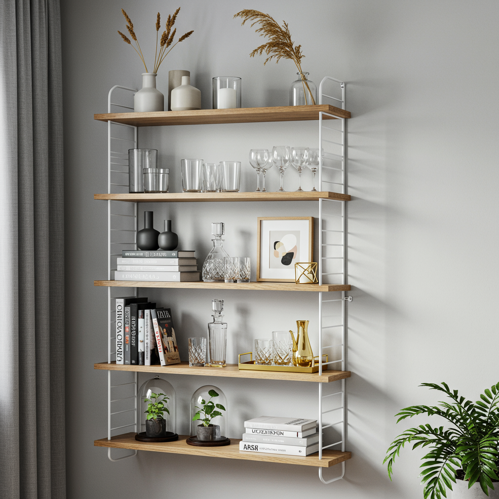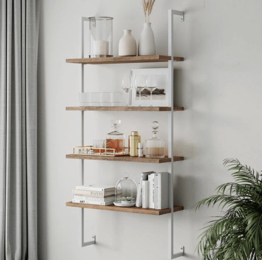 Take advantage of wall space and hang vertical shelves that can serve as a mini buffet to store dishes, glassware, etc.