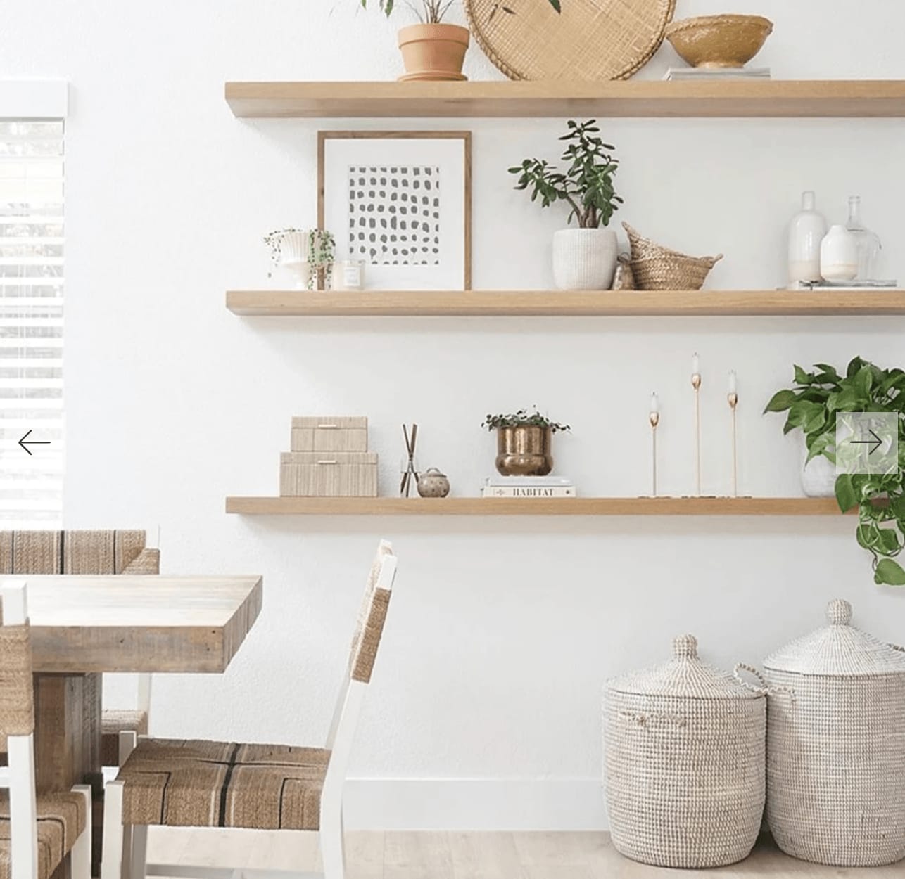 Long, floating shelves or even a rectangular light fixture can help to elongate the area and create the illusion of more space. If you opt for shelving, it also gives you more storage options and the opportunity to infuse more personality into the space. Shelfie anyone?