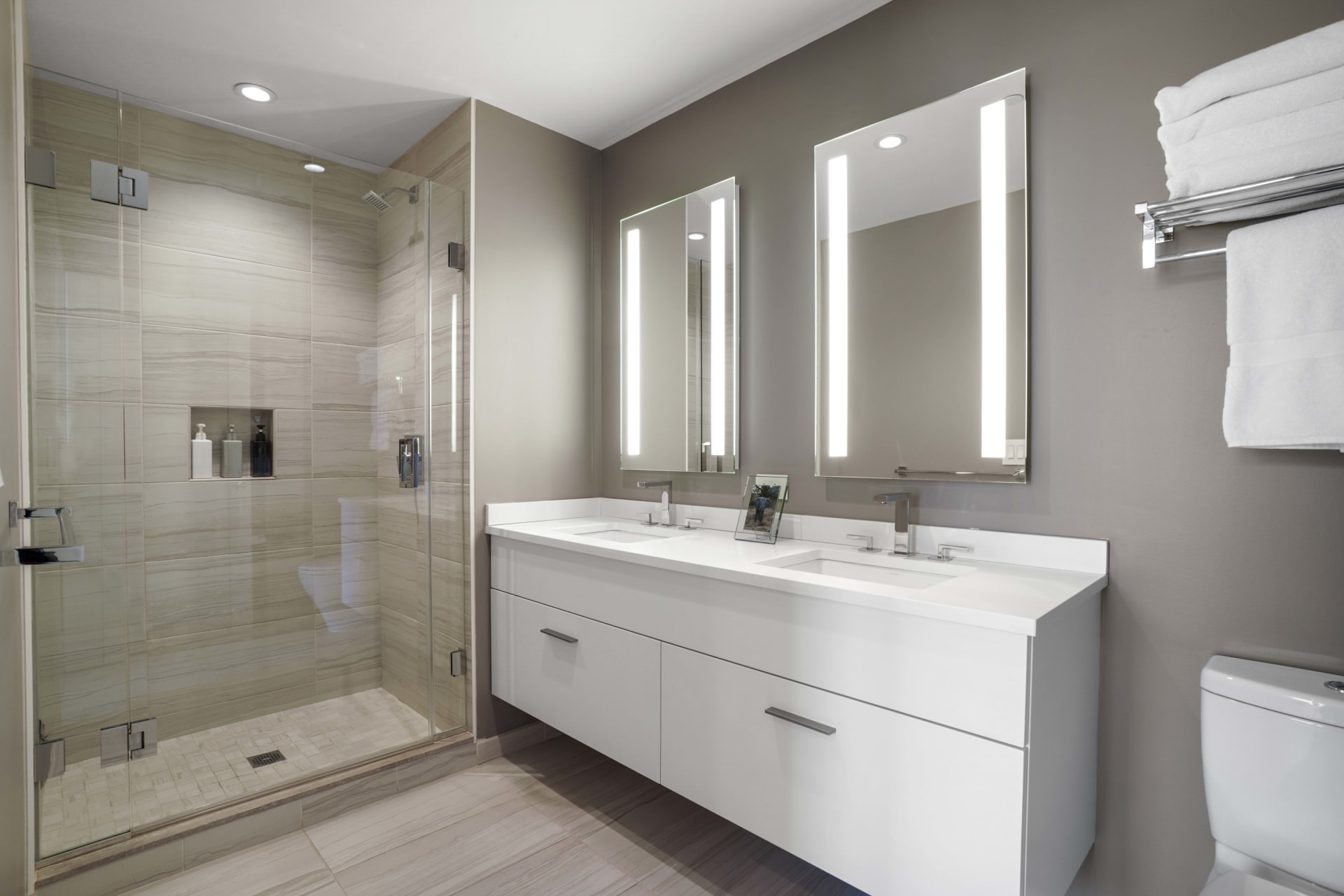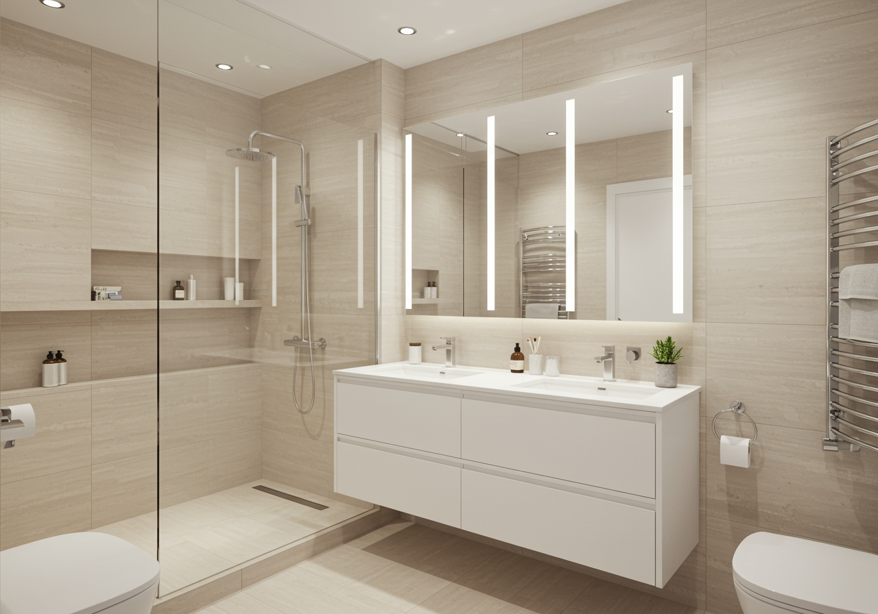 An en-suite primary bathroom with a double vanity and an oversized tiled shower with a rain showerhead is also highly sought features. In addition to adding convenience, the oversized shower is perceived as luxurious. Heated floors, shower jets/ body sprays, and heated towel racks turn an ordinary bathroom into a spa.